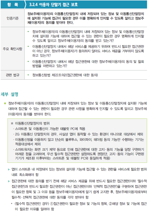 [ISMS/ISMS-P] 3.2.4 이용자 단말기 접근 보호 관리체계 인증기준 3번째 영역인 '3. 개인정보 처리 단계별 요구사항' 부터 살펴보자. 이번 영역에서는 총 22개의 세부 인증기준 중에서 '3.2. 개인정보 보유 및 이용 시 보호조치' 분야에서 '3.2.4 이용자 단말기 접근 보호' 항목을 확인해보자 해당 '3.2.4 이용자 단말기 접근 보호' 항목의 활동을 증빙하기 위한 증적자료 예시는 다음과 같다. 다음은 결함사례를 살펴보자. 정보보호 인증/ISMS-P 2021.11.20