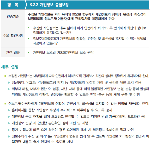 [ISMS/ISMS-P] 3.2.2 개인정보 품질보장 관리체계 인증기준 3번째 영역인 '3. 개인정보 처리 단계별 요구사항' 부터 살펴보자. 이번 영역에서는 총 22개의 세부 인증기준 중에서 '3.2. 개인정보 보유 및 이용 시 보호조치' 분야에서 '3.2.2 개인정보 품질보장' 항목을 확인해보자 해당 '3.2.2 개인정보 품질보장' 항목의 활동을 증빙하기 위한 증적자료 예시는 다음과 같다. 다음은 결함사례를 살펴보자. 정보보호 인증/ISMS-P 2021.11.20