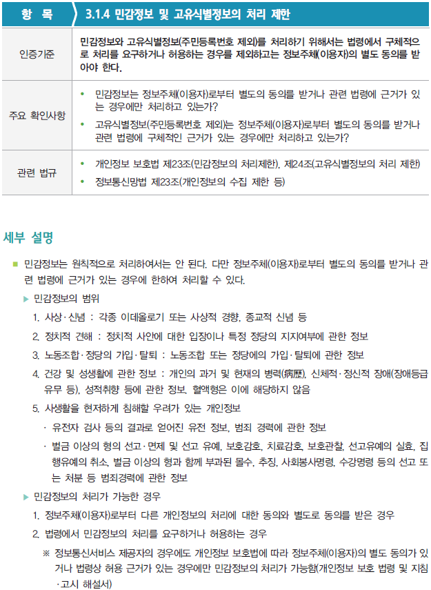 [ISMS/ISMS-P] 3.1.4 민감정보 및 고유식별정보의 처리 제한 관리체계 인증기준 3번째 영역인 '3. 개인정보 처리 단계별 요구사항' 부터 살펴보자. 이번 영역에서는 총 22개의 세부 인증기준 중에서 '3.1. 개인정보 수집 시 보호조치' 분야에서 '3.1.4 민감정보 및 고유식별정보의 처리 제한' 항목을 확인해보자 해당 '3.1.4 민감정보 및 교유식별정보의 처리 제한' 항목의 활동을 증빙하기 위한 증적자료 예시는 다음과 같다. 다음은 결함사례를 살펴보자. 정보보호 인증/ISMS-P 2021.11.20