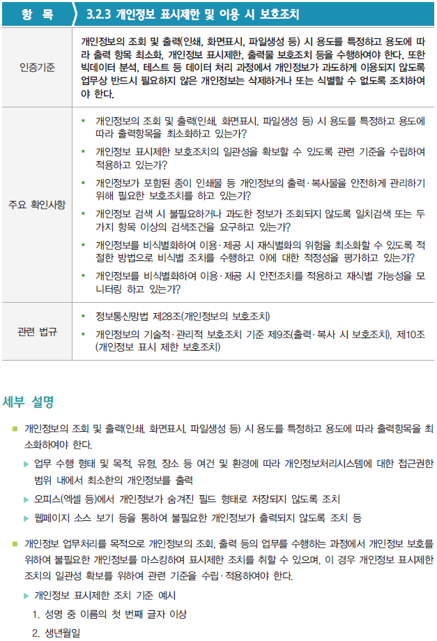 [ISMS/ISMS-P] 3.2.3 개인정보 표시제한 및 이용 시 보호조치 관리체계 인증기준 3번째 영역인 '3. 개인정보 처리 단계별 요구사항' 부터 살펴보자. 이번 영역에서는 총 22개의 세부 인증기준 중에서 '3.2. 개인정보 보유 및 이용 시 보호조치' 분야에서 '3.2.3 개인정보 표시제한 및 이용 시 보호조치' 항목을 확인해보자 해당 '3.2.3 개인정보 표시제한 및 이용 시 보호조치' 항목의 활동을 증빙하기 위한 증적자료 예시는 다음과 같다. 다음은 결함사례를 살펴보자. 정보보호 인증/ISMS-P 2021.11.20