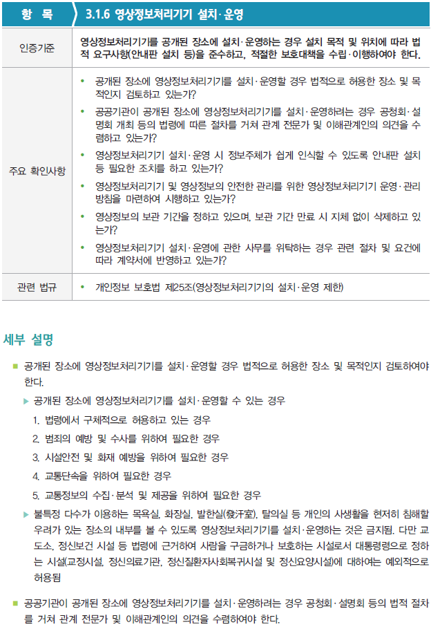 [ISMS/ISMS-P] 3.1.6 영상정보처리기기 설치·운영 관리체계 인증기준 3번째 영역인 '3. 개인정보 처리 단계별 요구사항' 부터 살펴보자. 이번 영역에서는 총 22개의 세부 인증기준 중에서 '3.1. 개인정보 수집 시 보호조치' 분야에서 '3.1.6 영상정보처리기기 설치·운영' 항목을 확인해보자 해당 '3.1.6 영상정보처리기기 설치·운영' 항목의 활동을 증빙하기 위한 증적자료 예시는 다음과 같다. 다음은 결함사례를 살펴보자. 정보보호 인증/ISMS-P 2021.11.20