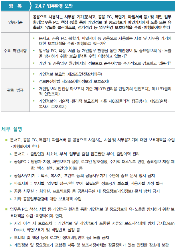 [ISMS/ISMS-P] 2.4.7 업무환경 보안 관리체계 인증기준 2번째 영역인 '2. 보호대책 요구사항' 부터 살펴보자. 이번 영역에서는 총 64개의 세부 인증기준 중에서 '2.4. 물리 보안' 분야에서 '2.4.7 업무환경 보안' 항목을 확인해보자 해당 '2.4.7 업무환경 보안' 항목의 활동을 증빙하기 위한 증적자료 예시는 다음과 같다. 다음은 결함사례를 살펴보자. 정보보호 인증/ISMS-P 2021.11.16