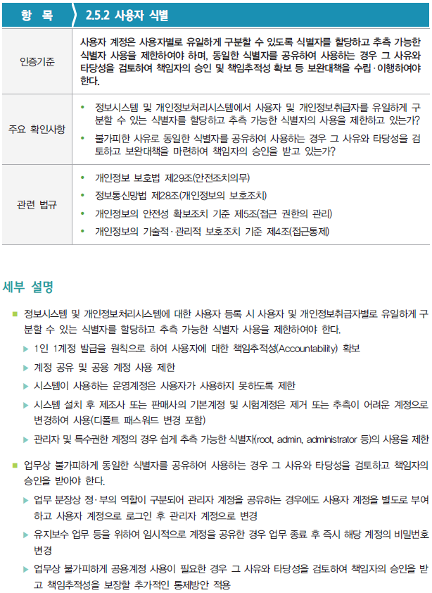 [ISMS/ISMS-P] 2.5.2 사용자 식별 관리체계 인증기준 2번째 영역인 '2. 보호대책 요구사항' 부터 살펴보자. 이번 영역에서는 총 64개의 세부 인증기준 중에서 '2.5. 인증 및 권한관리' 분야에서 '2.5.2 사용자 식별' 항목을 확인해보자 해당 '2.5.2 사용자 식별' 항목의 활동을 증빙하기 위한 증적자료 예시는 다음과 같다. 다음은 결함사례를 살펴보자. 정보보호 인증/ISMS-P 2021.11.16