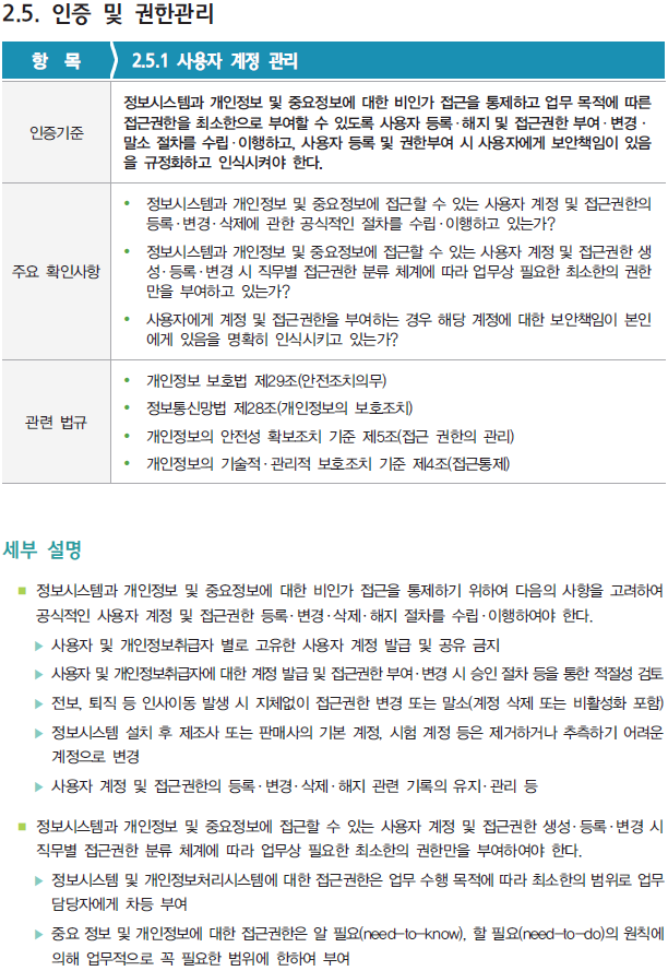 [ISMS/ISMS-P] 2.5.1 사용자 계정 관리 관리체계 인증기준 2번째 영역인 '2. 보호대책 요구사항' 부터 살펴보자. 이번 영역에서는 총 64개의 세부 인증기준 중에서 '2.5. 인증 및 권한관리' 분야에서 '2.5.1 사용자 계정 관리' 항목을 확인해보자 해당 '2.5.1 사용자 계정 관리' 항목의 활동을 증빙하기 위한 증적자료 예시는 다음과 같다. 다음은 결함사례를 살펴보자. 정보보호 인증/ISMS-P 2021.11.16