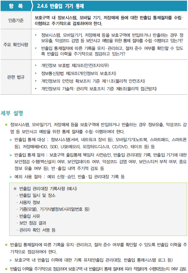 [ISMS/ISMS-P] 2.4.6 반출입 기기 통제 관리체계 인증기준 2번째 영역인 '2. 보호대책 요구사항' 부터 살펴보자. 이번 영역에서는 총 64개의 세부 인증기준 중에서 '2.4. 물리 보안' 분야에서 '2.4.6 반출입 기기 통제' 항목을 확인해보자 해당 '2.4.6 반출입 기기 통제' 항목의 활동을 증빙하기 위한 증적자료 예시는 다음과 같다. 다음은 결함사례를 살펴보자. 정보보호 인증/ISMS-P 2021.11.16