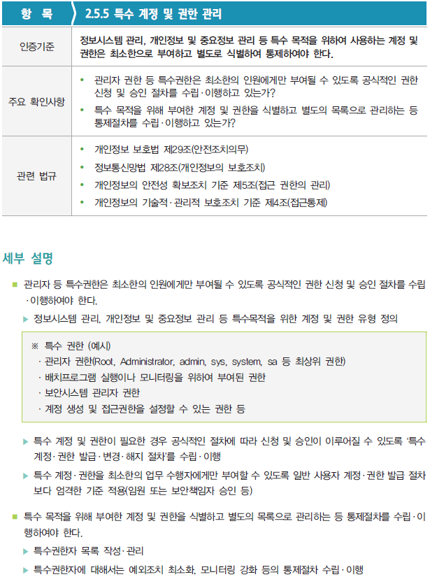 [ISMS/ISMS-P] 2.5.5 특수 계정 및 권한 관리 관리체계 인증기준 2번째 영역인 '2. 보호대책 요구사항' 부터 살펴보자. 이번 영역에서는 총 64개의 세부 인증기준 중에서 '2.5. 인증 및 권한관리' 분야에서 '2.5.5 특수 계정 및 권한 관리' 항목을 확인해보자 해당 '2.5.5 특수 계정 및 권한 관리' 항목의 활동을 증빙하기 위한 증적자료 예시는 다음과 같다. 다음은 결함사례를 살펴보자. 정보보호 인증/ISMS-P 2021.11.17