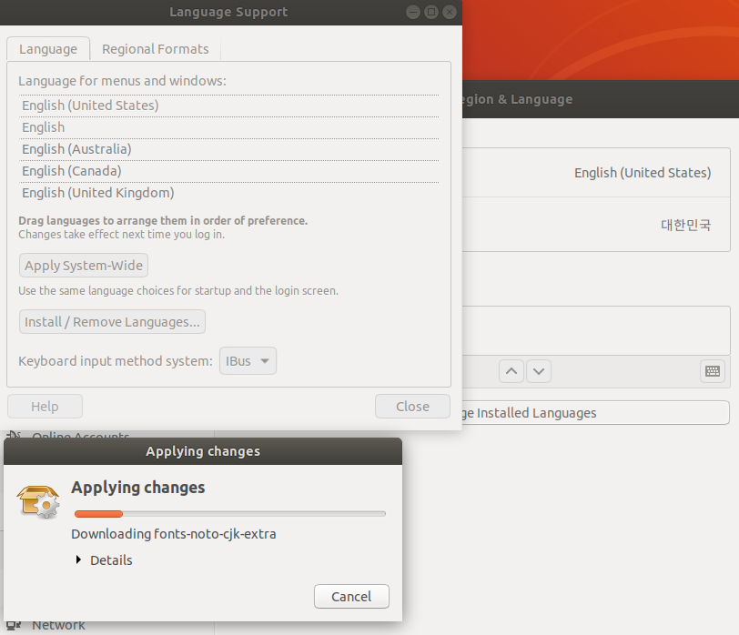 우분투 설치 후 한글 입력이 안될 것이다. 설정을 통해 한글 입력에 대해 알아도록 하자. - Settings -> Region&Language -> Manage Installed Languages -> Install/Remove Language - 리부트하기 (reboot) - ibus-setup -> Input Method -> Add -> Korean(Hangul) 추가 - settings -> Region&Language -> Add an Input Source -> Korean(Hangul) - Shift+space 눌러서 한글 정상 입력 확인.